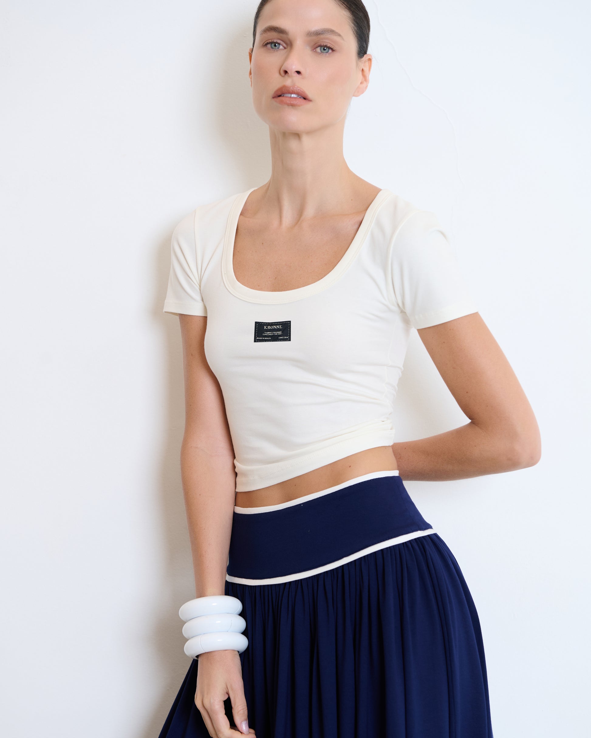 Babylook com decote redondo e manga curta, detalhe da etiqueta na frente.