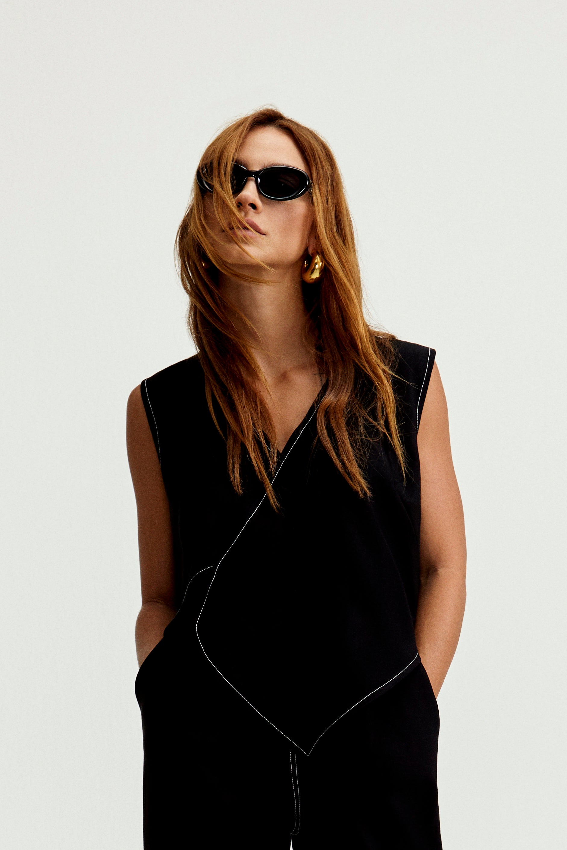 Blusa assimétrica com formado arredondado nas pontas, detalhes pespontados em branco.
