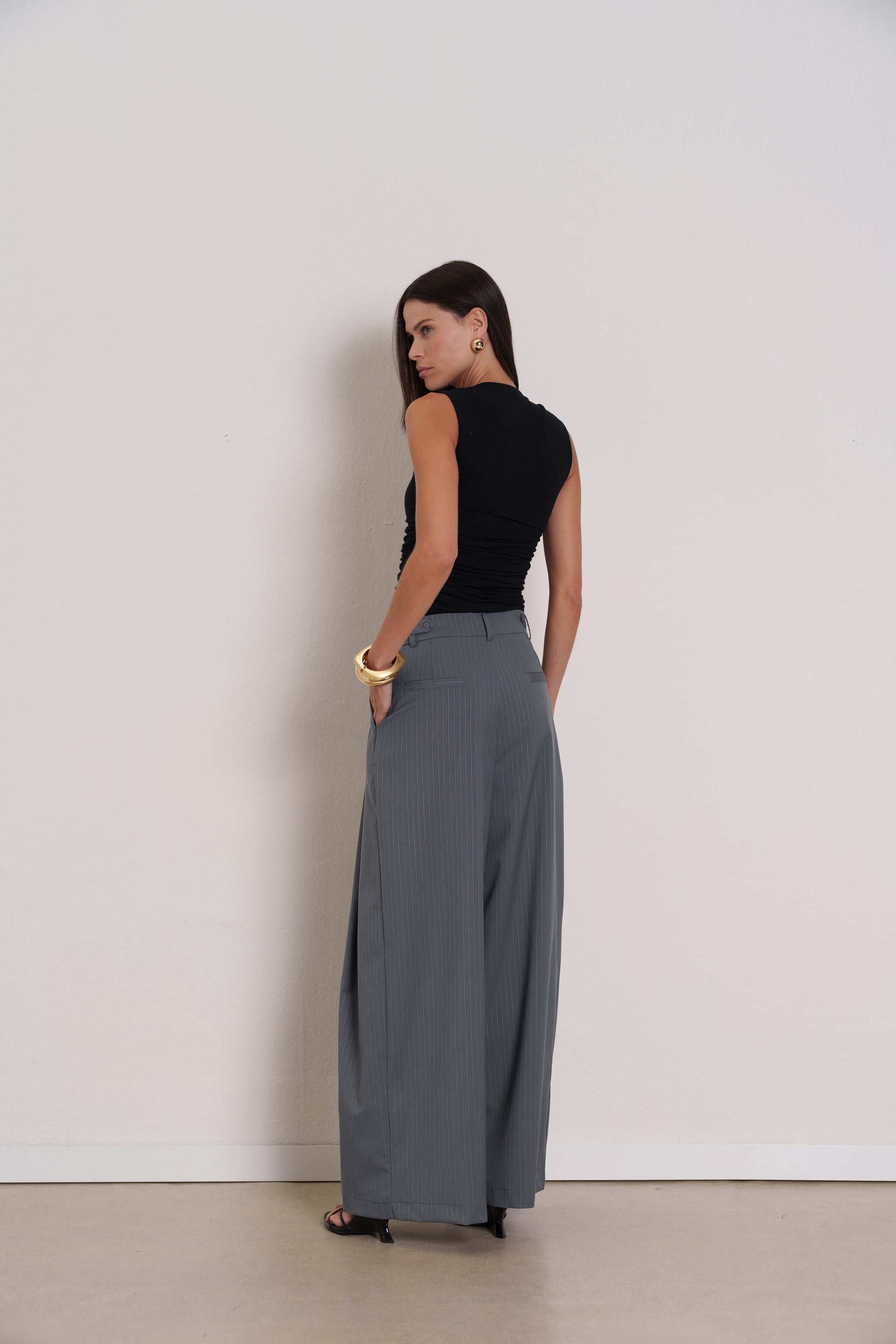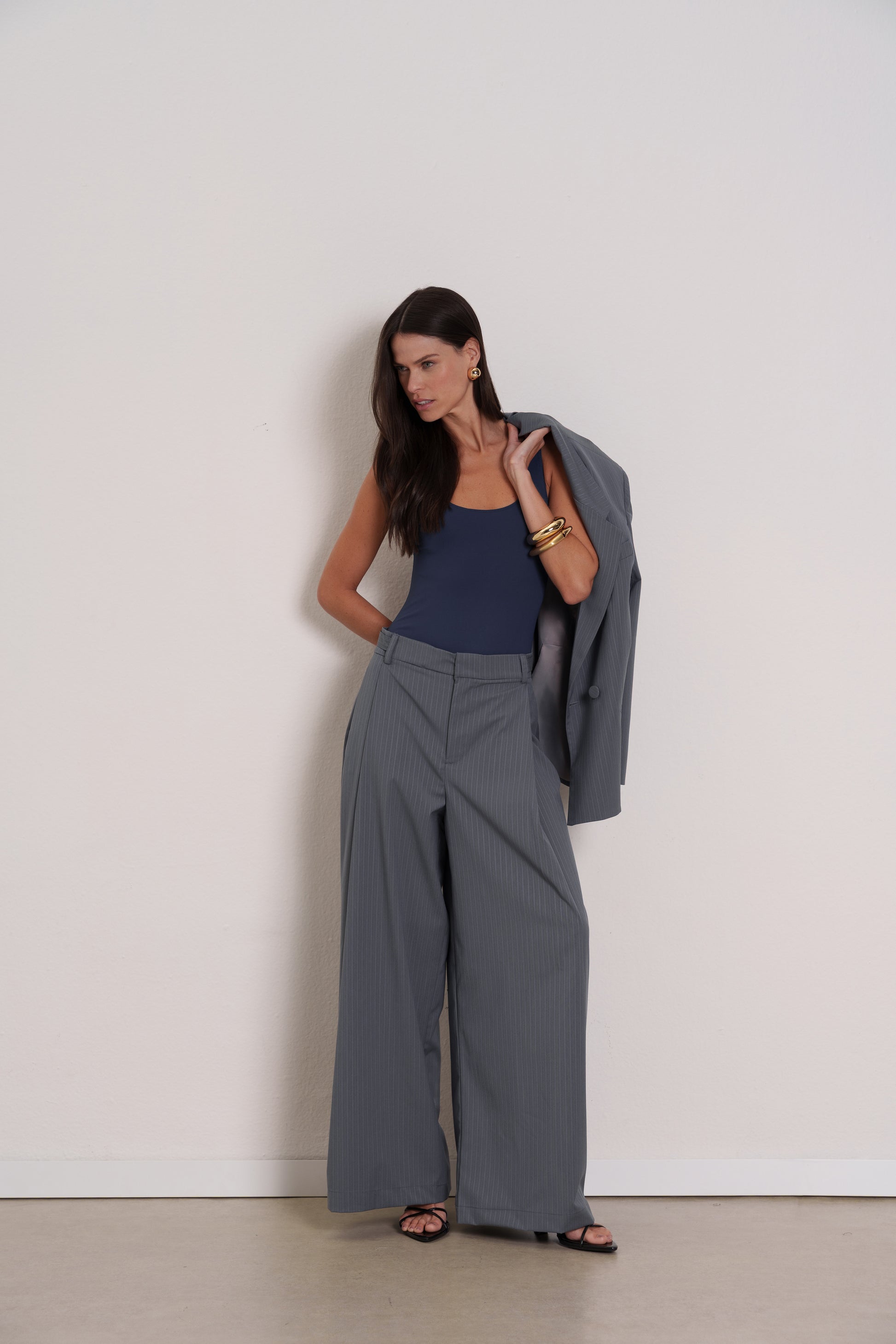 Calça em alfaiataria com modelagem ampla com pregas na frente, detalhe de botão no cós, bolso faca, cintura alta. Estampa em risca de giz.