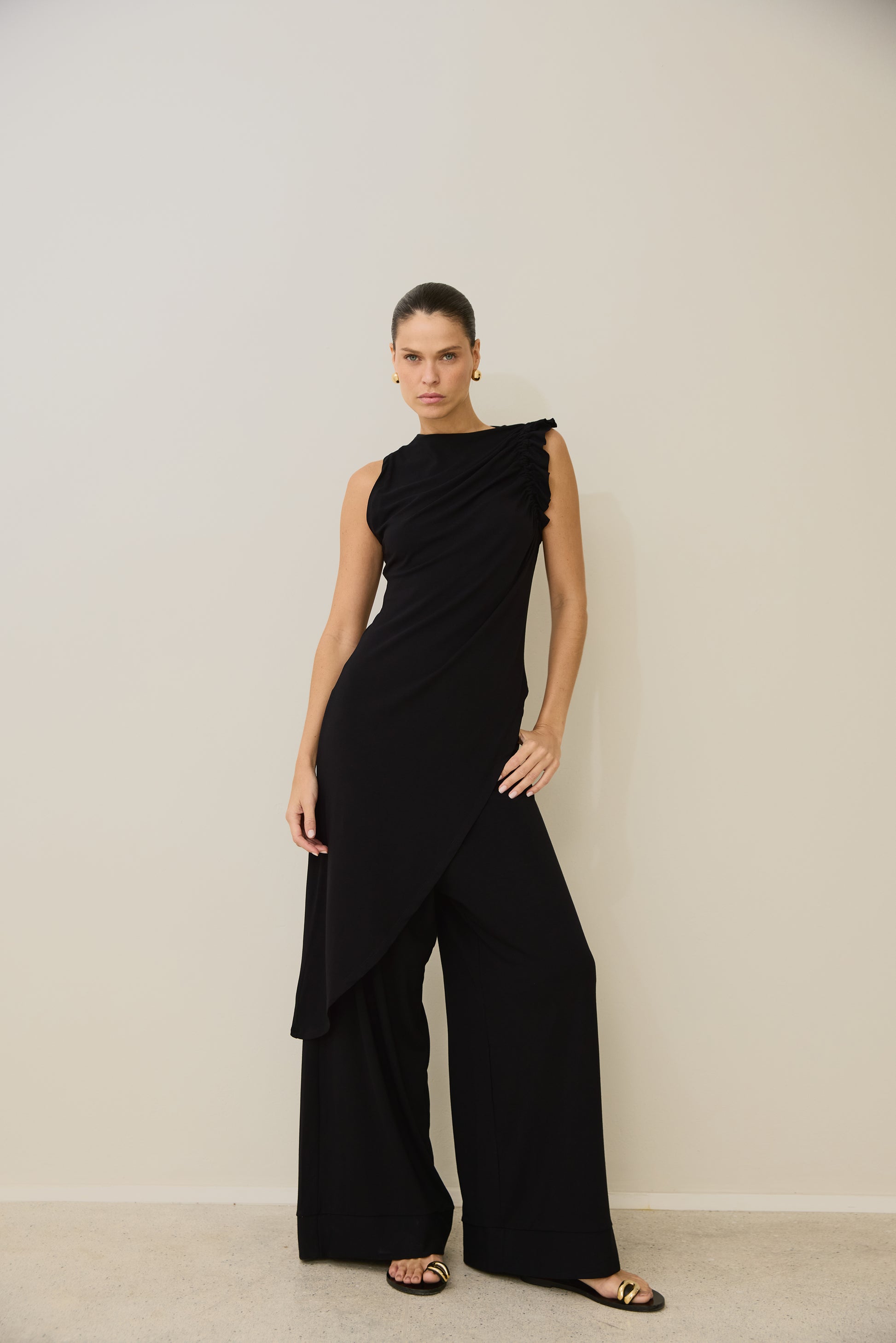CONJUNTO BLUSA ASSIMÉTRICA DRAPEADA + CALÇA CÓS ELÁSTICO