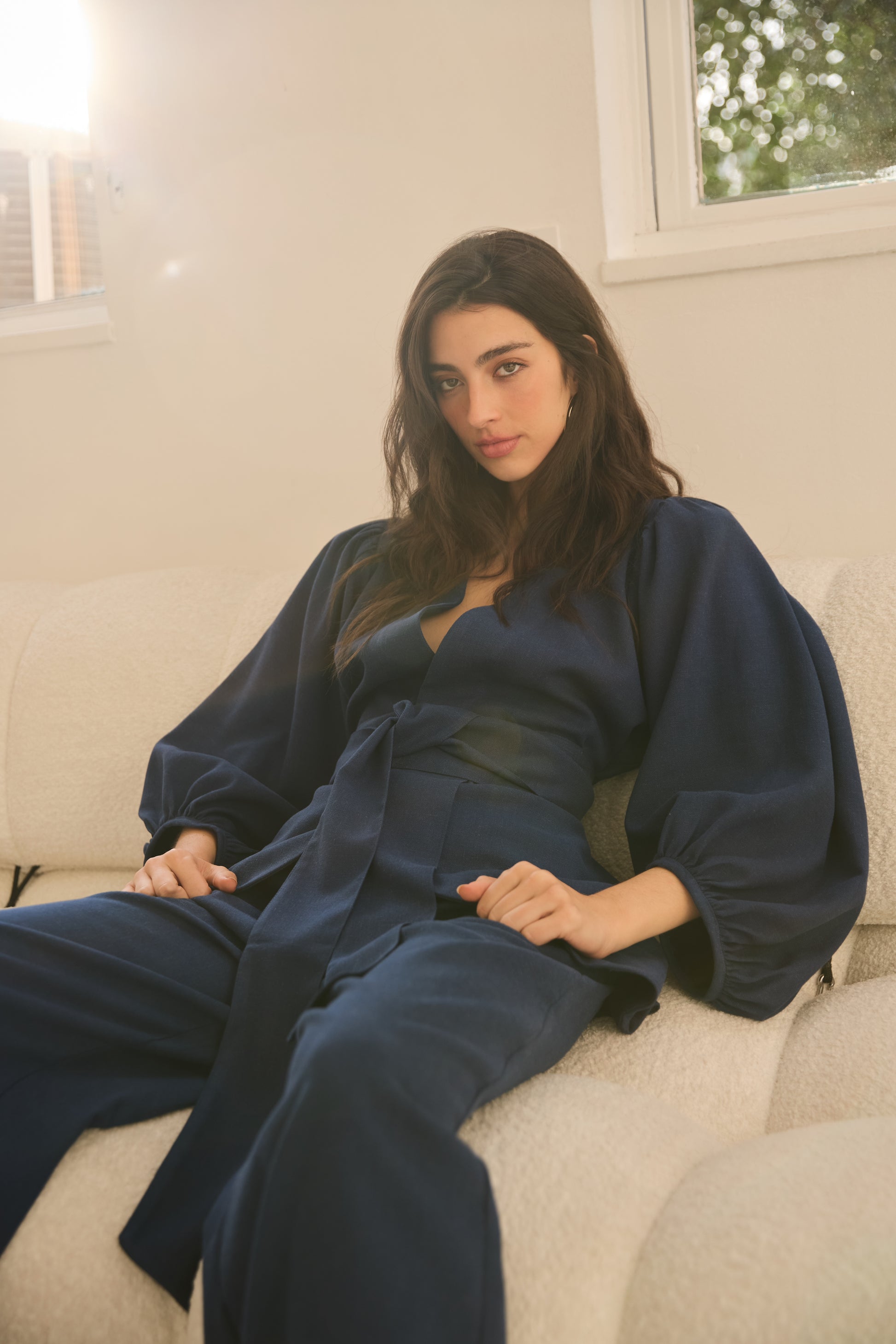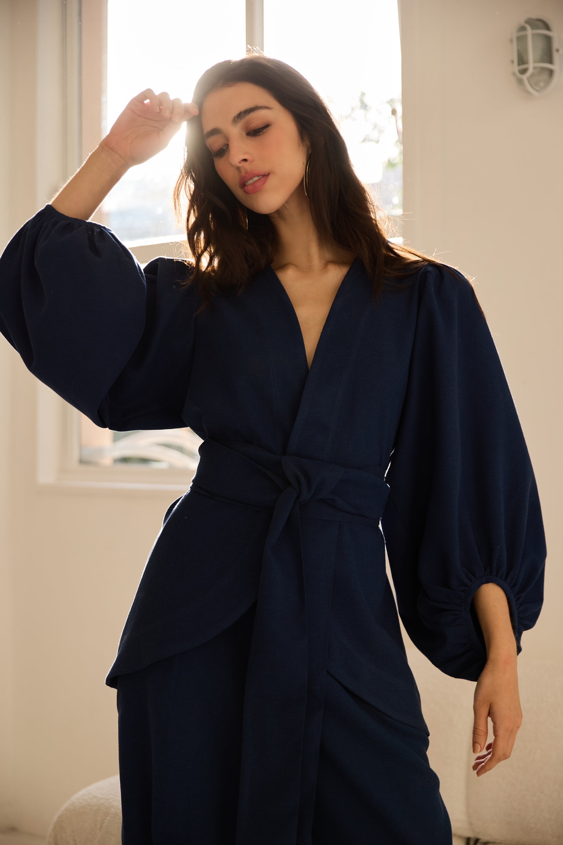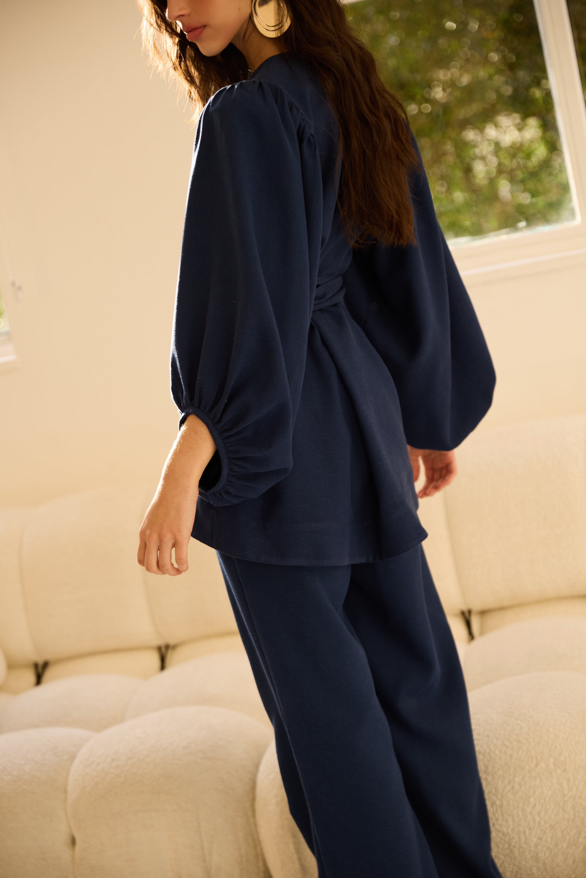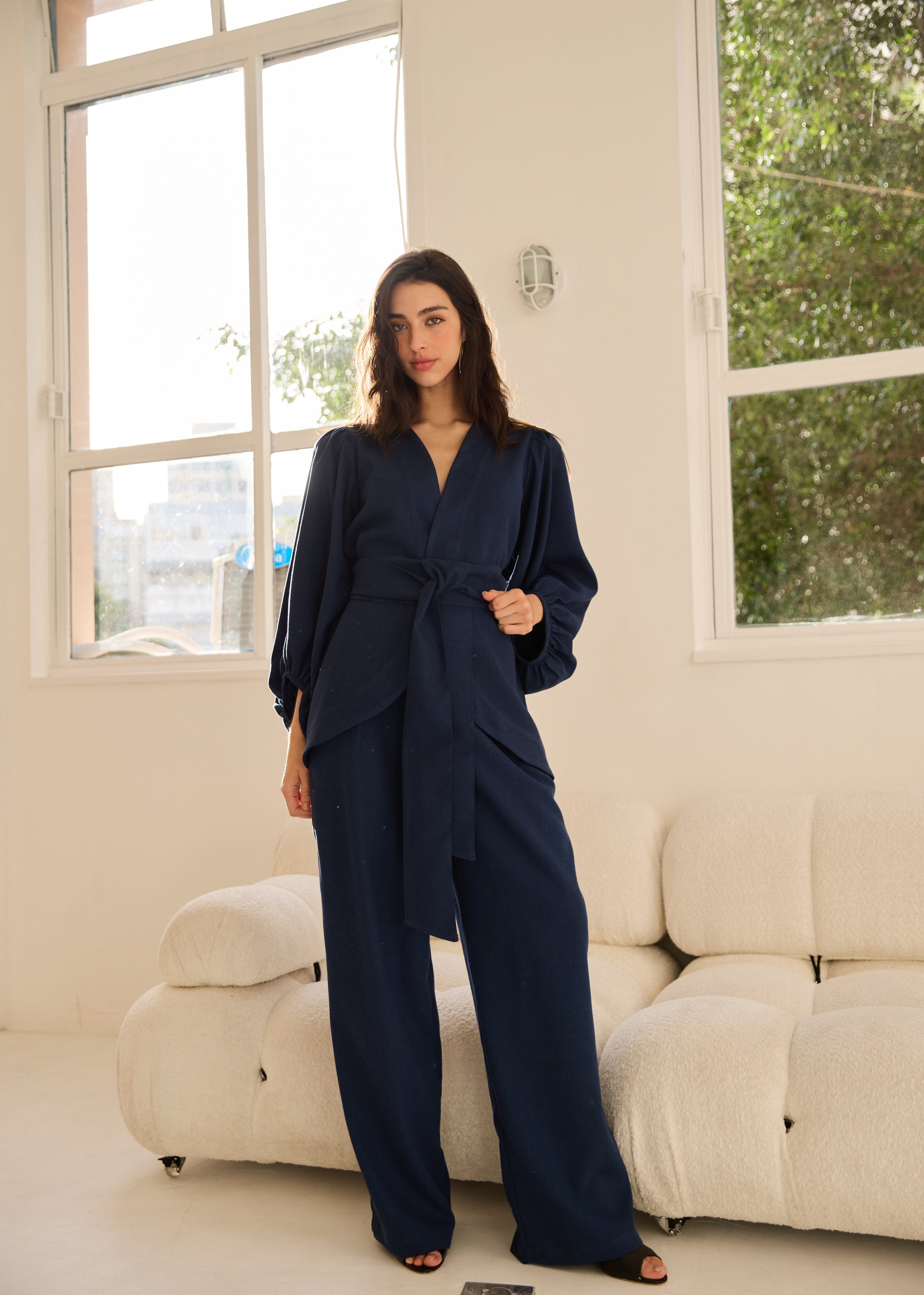 Conjunto de kimono manga bufante e faixa e calça de alfaiataria cintura alta com bolsos. Confeccionado em linho
