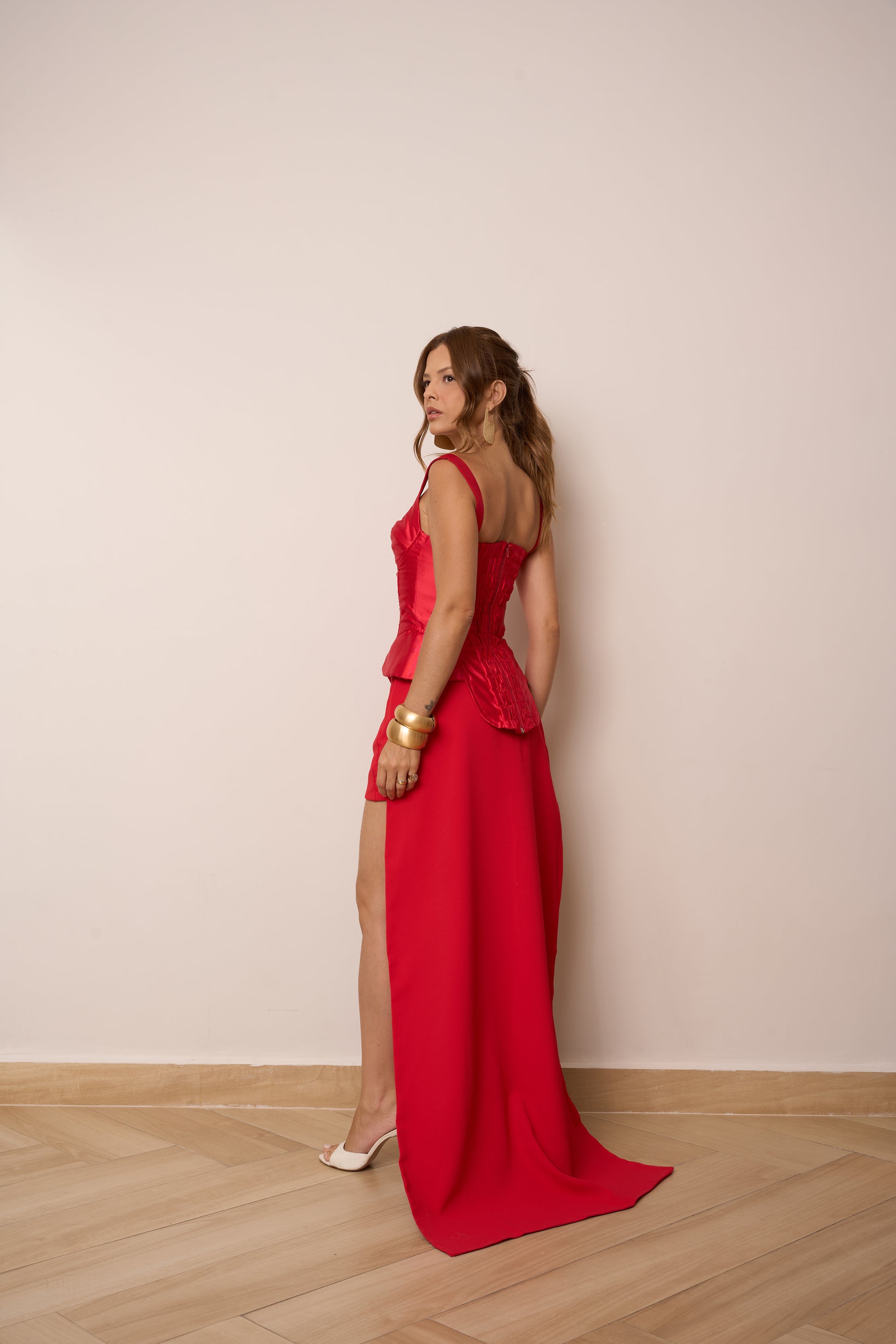 O top estruturado em tecido acetinado traz modelagem de corset com recortes que valorizam a silhueta. Possui alças largas, busto marcado e acabamento levemente brilhoso que reforça o efeito luxuoso. A barra em formato pontiagudo alonga a linha da cintura e traz um toque dramático e sofisticado.