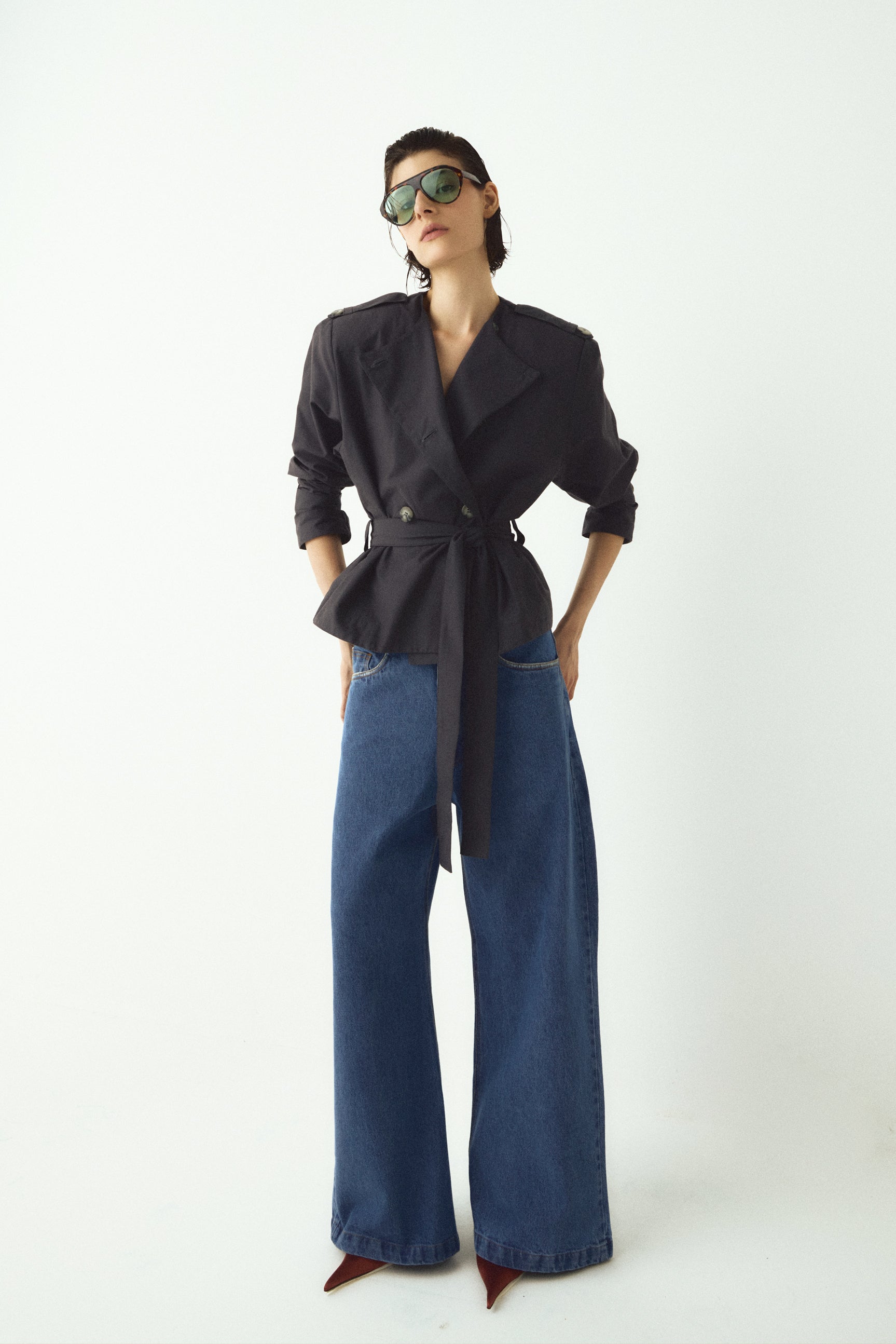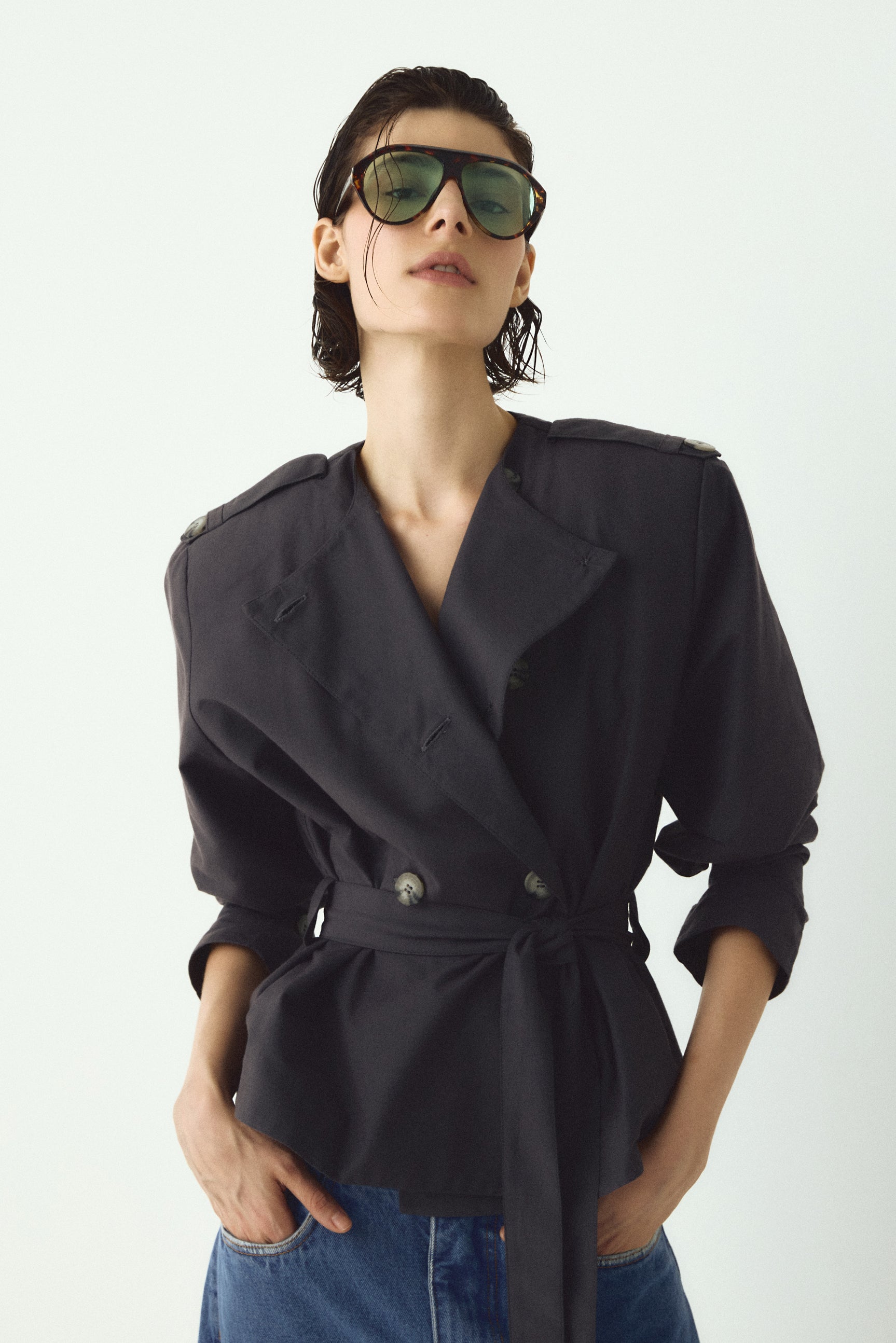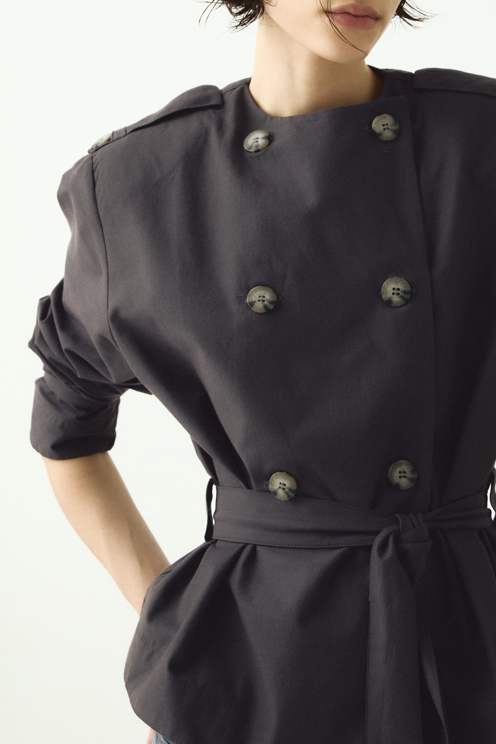 Jaqueta de alfaiataria com inspiração utilitária, confeccionada em tecido encorpado, com modelagem estruturada e caimento impecável. Possui fechamento transpassado com botões frontais, gola ampla, ombros marcados com abas e cinto do próprio tecido para ajuste na cintura, valorizando a silhueta. As mangas longas com leve volume reforçam o visual contemporâneo e sofisticado. Em tom escuro e atemporal, é uma peça versátil que transita com elegância entre produções urbanas e looks mais refinados.