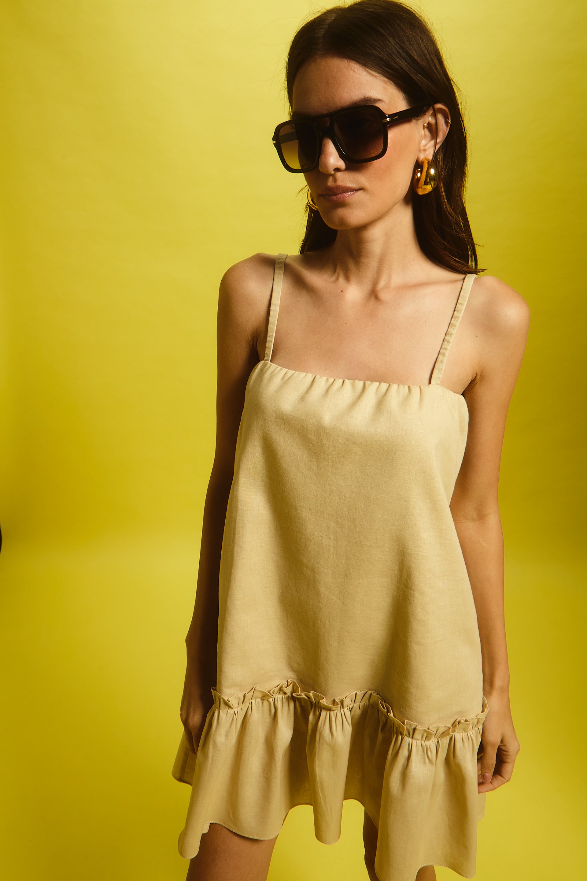 Vestido solto com alcinha, confeccionado em linho.