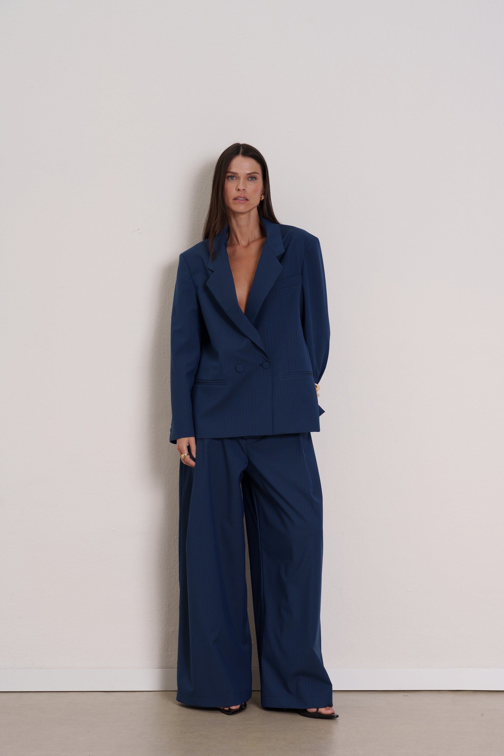 Blazer com modelagem oversized, com caimento amplo e estruturado, trazendo imponência e elegância ao visual. Estampa com listras discretas em padronagem fina vertical, que alongam a silhueta e conferem sofisticação clássica. Lapela clássica de ponta, fechamento frontal com botão único forrado. Bolsos embutidos na parte inferior, reforçando a estética clean. Ombros levemente estruturados, realçando a alfaiataria moderna.