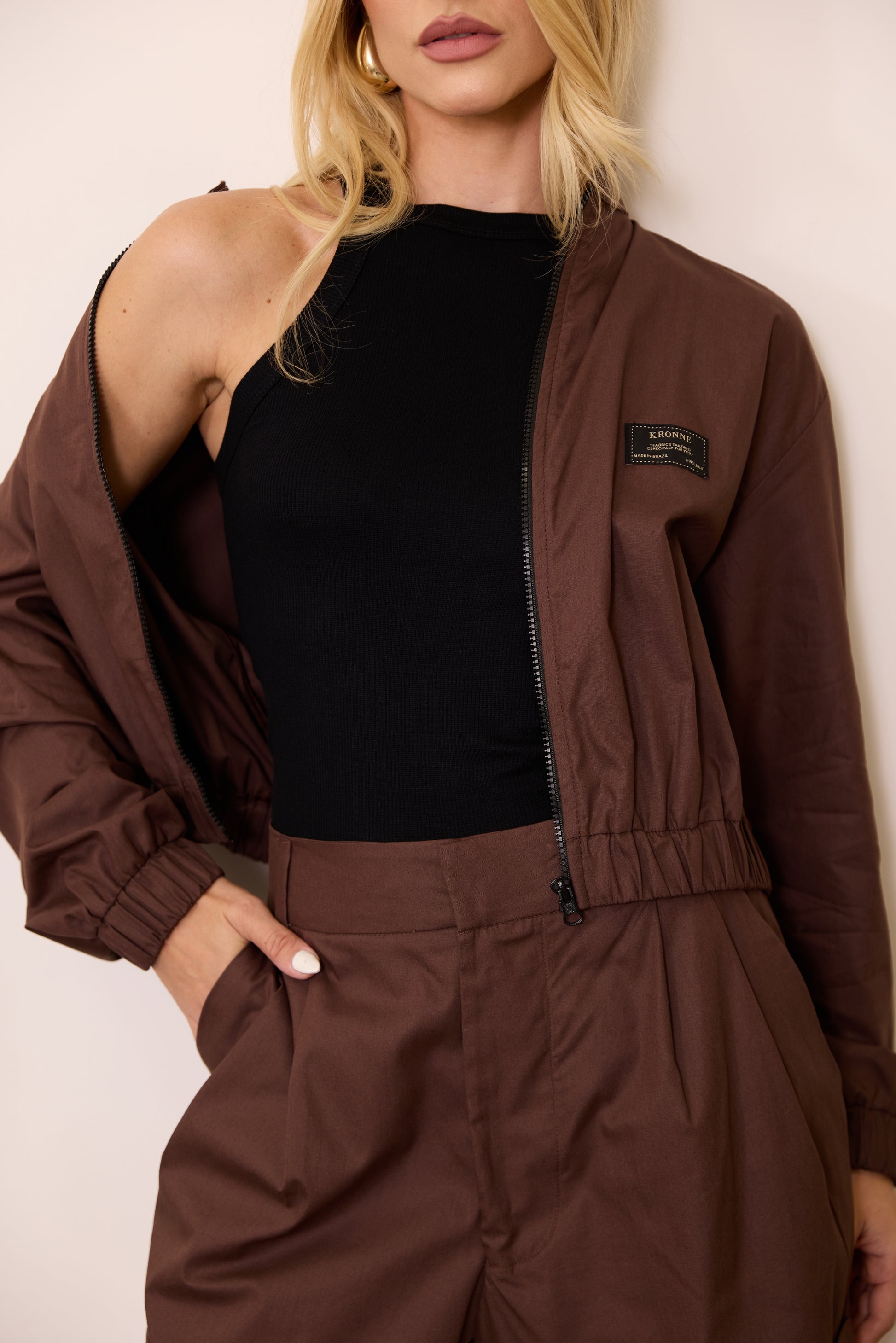 Bomber com comprimento menor, manga longa com zíper na frente e etiqueta. Confeccionada em tricoline.