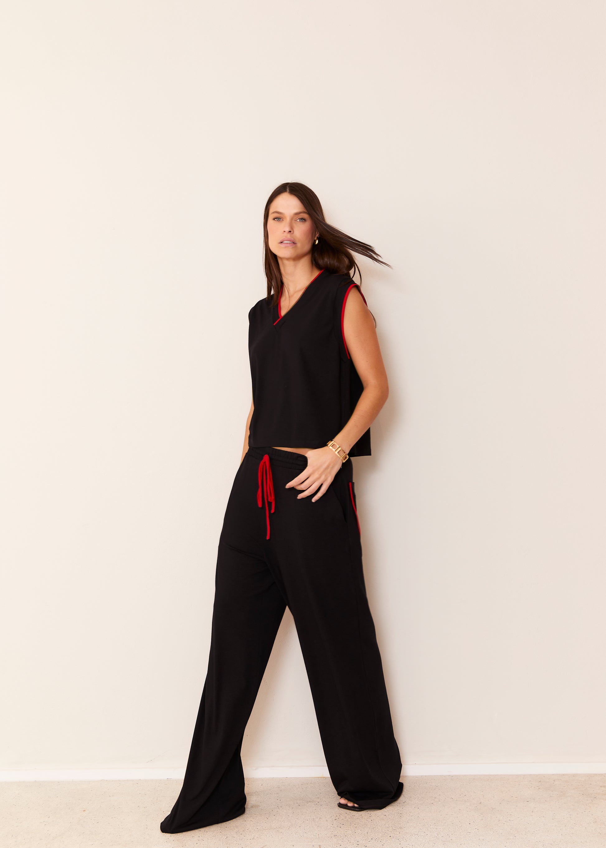 Conjunto de blusa regata com decote V e detalhe de viés vermelho. Calça cintura alta com elástico no cós e ajustável, possui bolsos e viés vermelho. Confeccionado em malha.