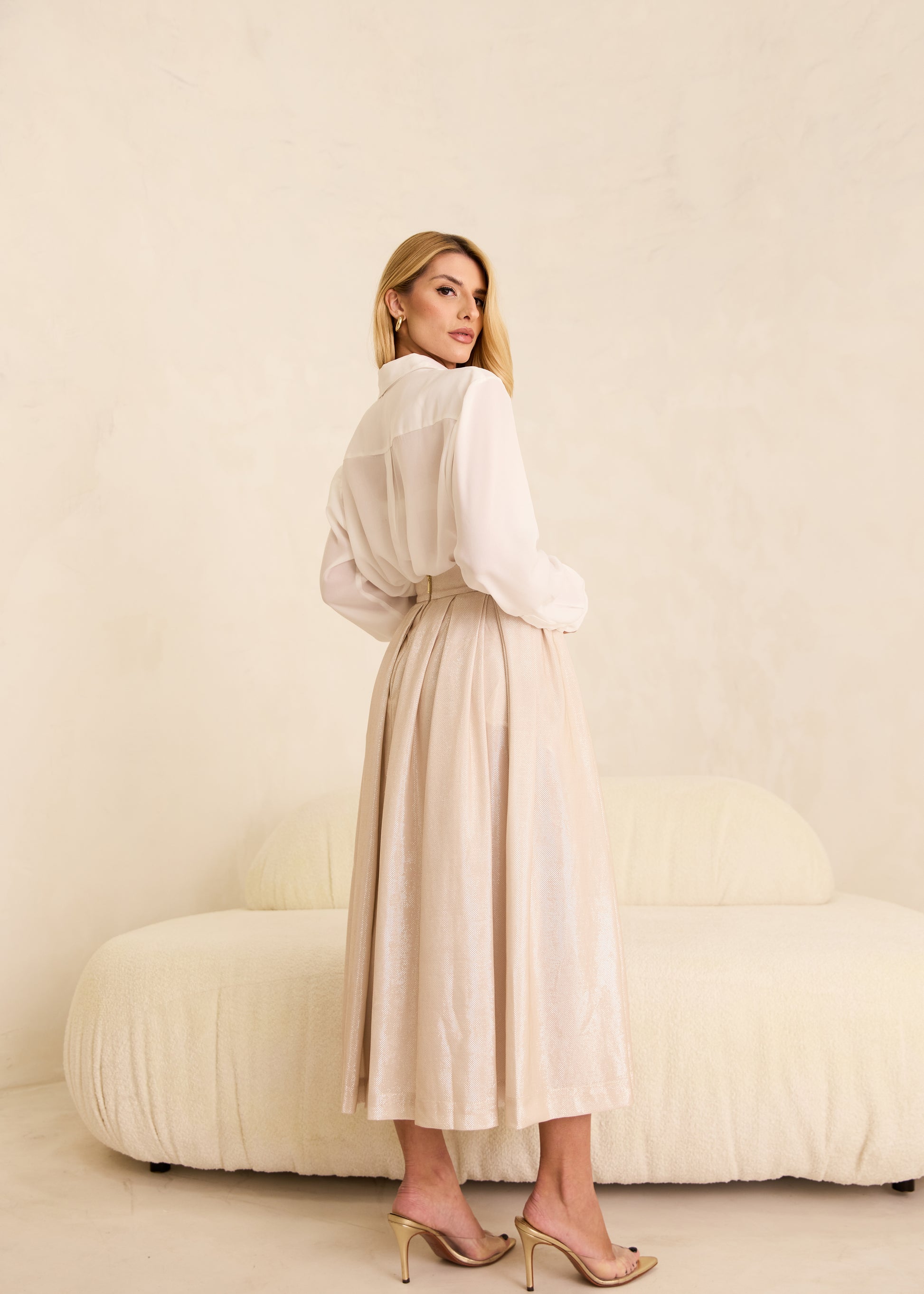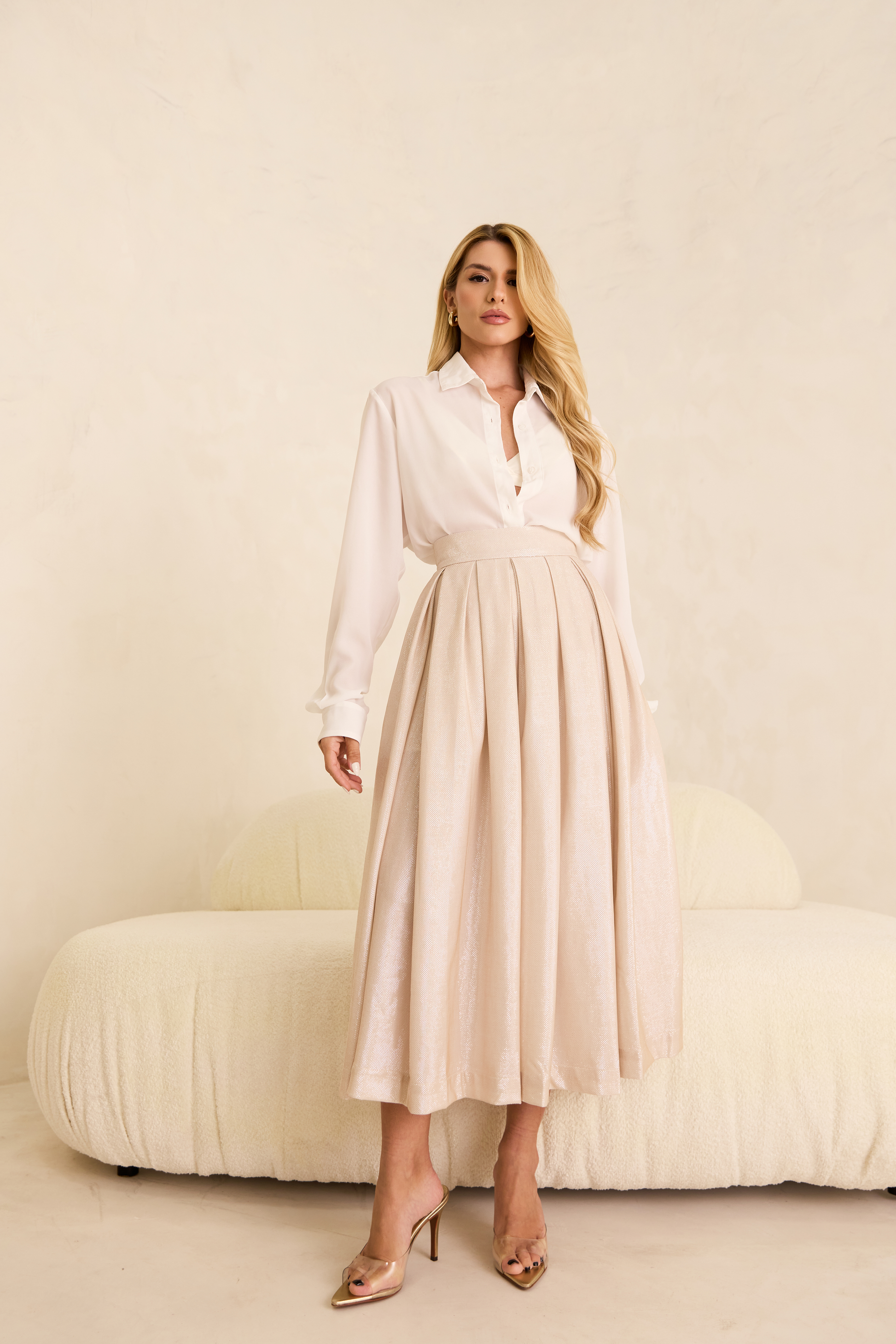 Saia midi com pregas, cintura alta e fechamento por zíper. Confeccionada em tecido plano com fios de lurex.