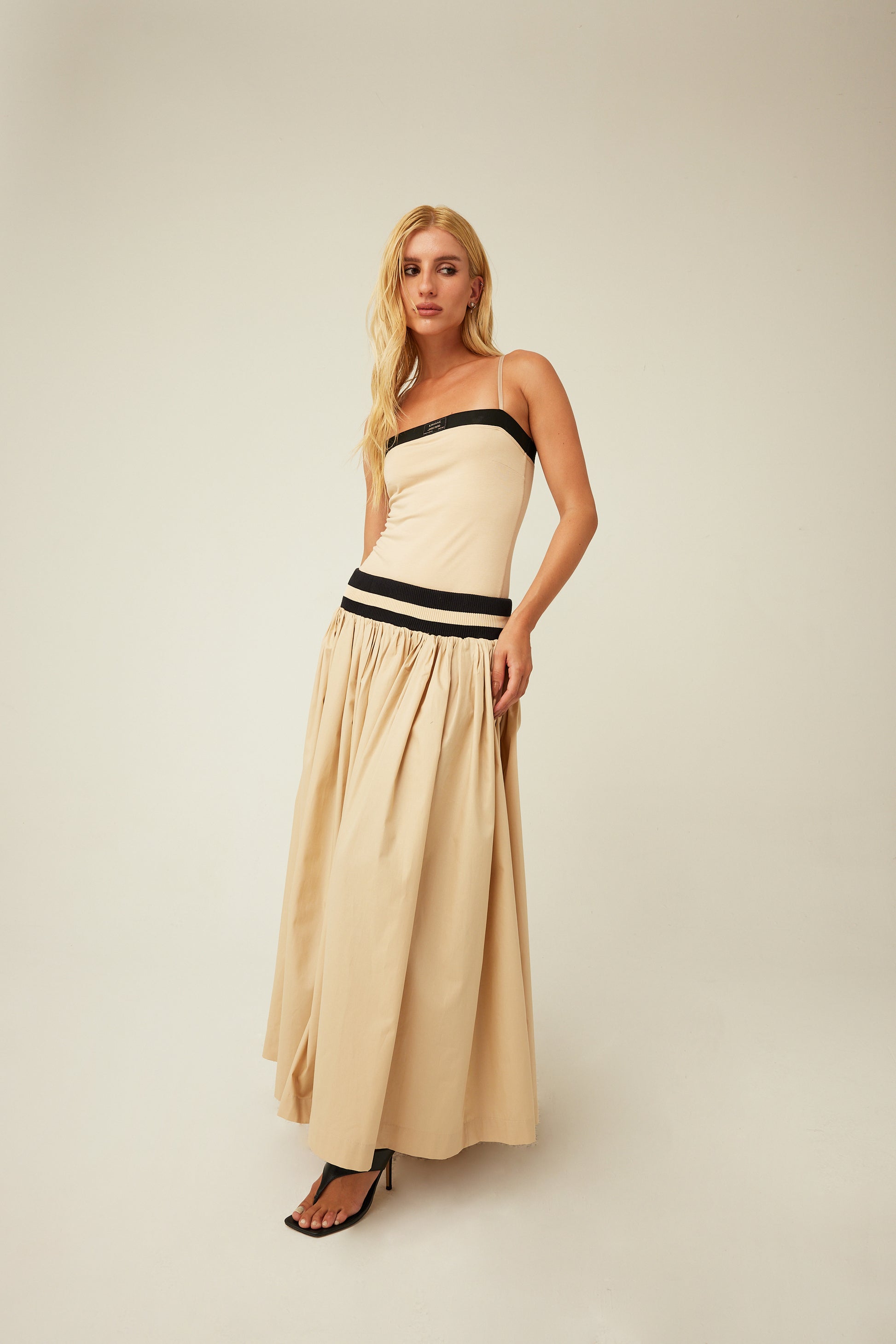 Saia longa franzida em tricoline com cós de elástico largo.