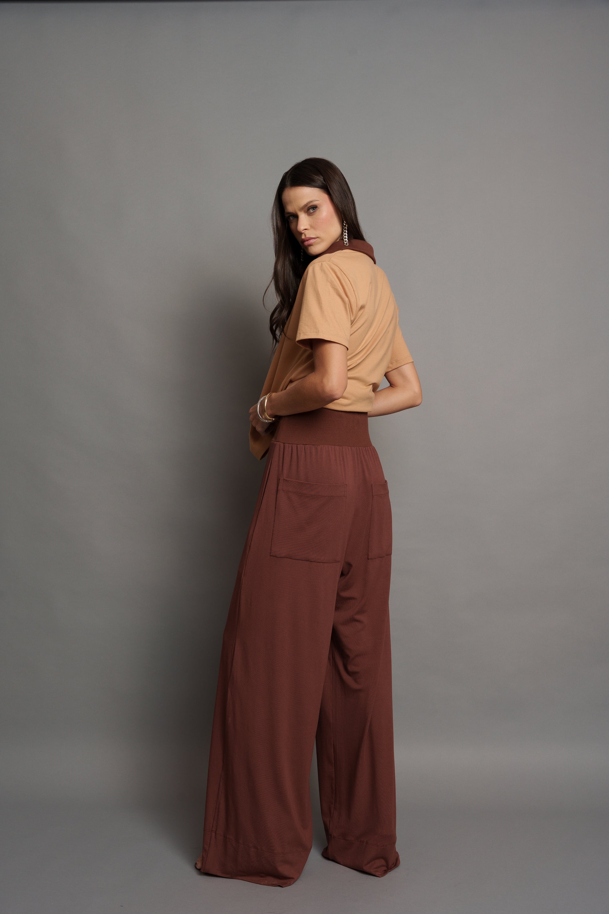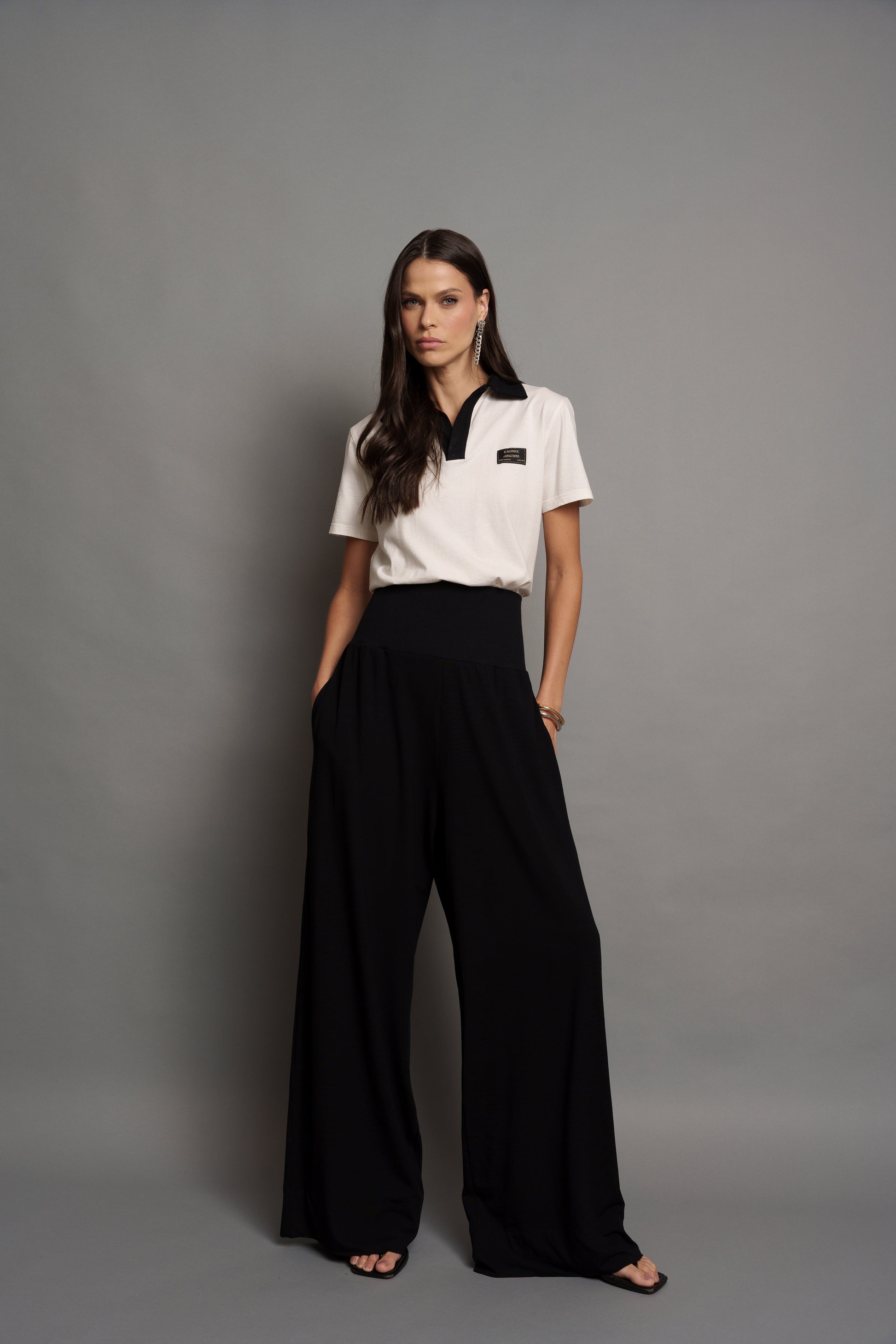 T-shirt com gola polo aberta e etiqueta Kronne na frente. Calça cintura alta com pala larga, modelagem ampla com bolsos atrás. Confeccionado em malha premium.